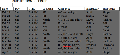​Substitution Schedule for instructors, please update whenever you know you will be unavailable